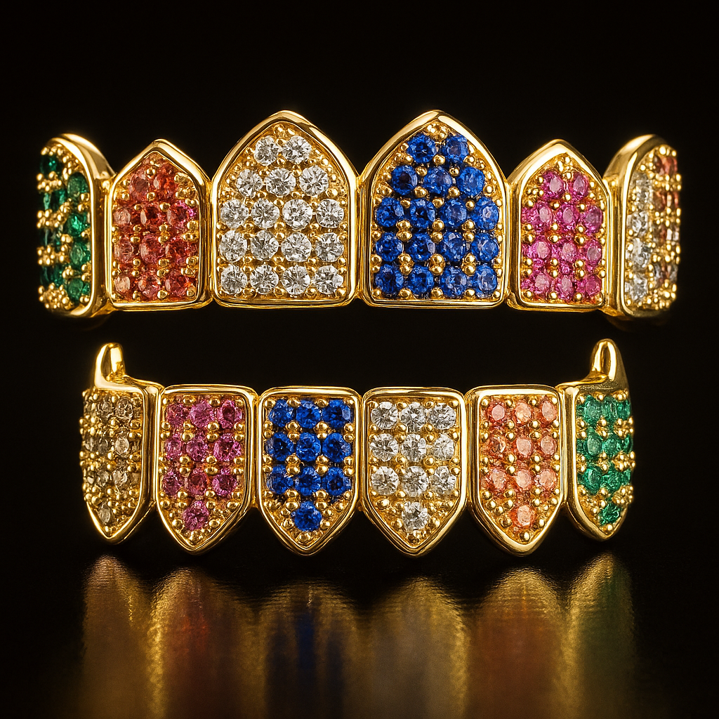 Three-piece grillz set inspired by Uzi’s fearless self-expression — polished metal base flooded with lab diamonds for that cosmic gleam.